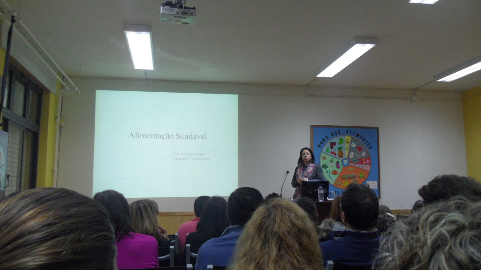 No passado dia 19 de fevereiro, pelas 20.horas, realizou-se na escola sede uma palestra proferida pela Enfermeira Andreia Rodrigues do Hospital de Braga sobre o tema “Alimentação Saudável”. A organização do evento foi da responsabilidade dos formadores e formandos da turma EFA-B3. A turma expôs os seus trabalhos realizados sobre o tema de vida estudado, desde o início do ano letivo, “Alimentação Saudável”, nomeadamente: uma roda dos alimentos, um painel com o abecedário da alimentação, cartazes e um puzzle, que serão utilizados pelas Escolas do Agrupamento. No final da palestra, foi projetado um pequeno vídeo com os melhores momentos dos formandos durante a realização dos trabalhos. A Enfermeira mediu a tensão aos presentes que o solicitaram. Por último, toda a equipa contemplou os presentes através de um convívio com alimentos saudáveis. Foram oferecidas as seguintes recordações: um marcador sobre ervas aromáticas e doenças provocadas por uma má alimentação e uma receita saudável.